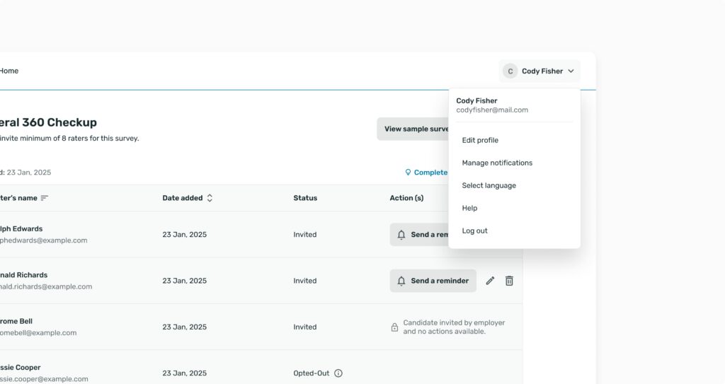 Candidates benefit from a smoother, more intuitive journey—from account creation to inviting raters to tracking progress. The refreshed interface offers faster navigation, better mobile usability, and a more transparent view of each checkup. Combined with clearer guidance and flexible options, candidates gain confidence and control throughout the process, resulting in fewer barriers and a more positive experience overall.