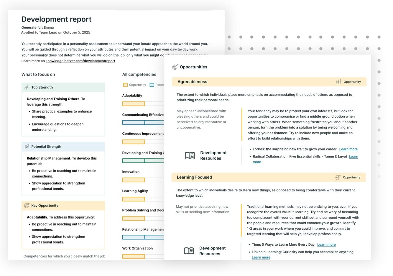 You can also customize development reports to reflect your company’s values or to create a language framework for discussing talent management.